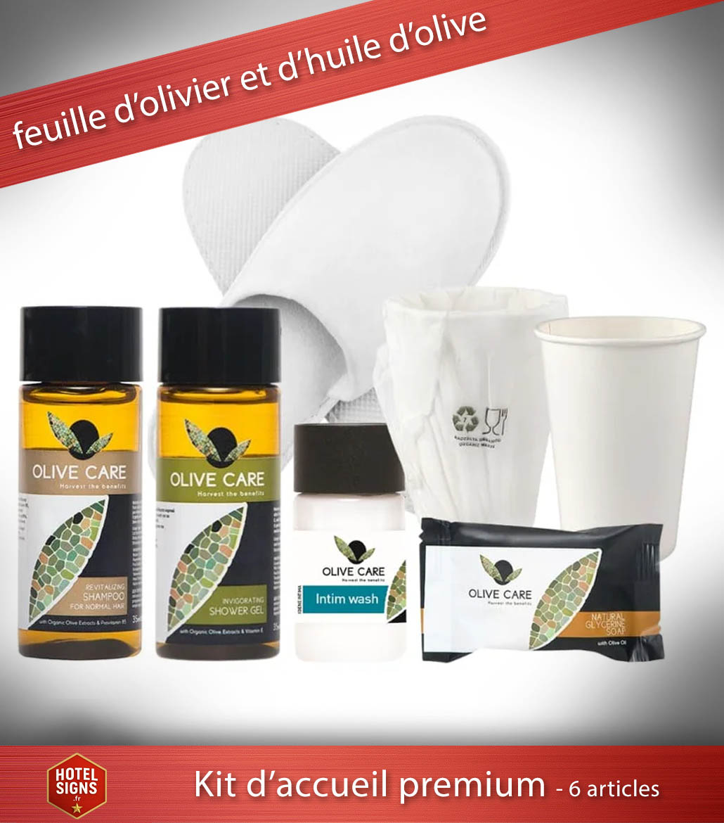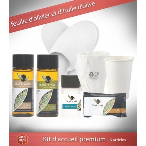 Une sélection de produits de bains aux extraits de feuilles d'olivier et huile d'olive riche issue de l'agriculture biologique certifiée, mais aussi Un ensemble de chaussons raffinés et un verre de courtoisie. Le kit idéal pour satisfaire vos clients et valoriser l'image de votre établissement